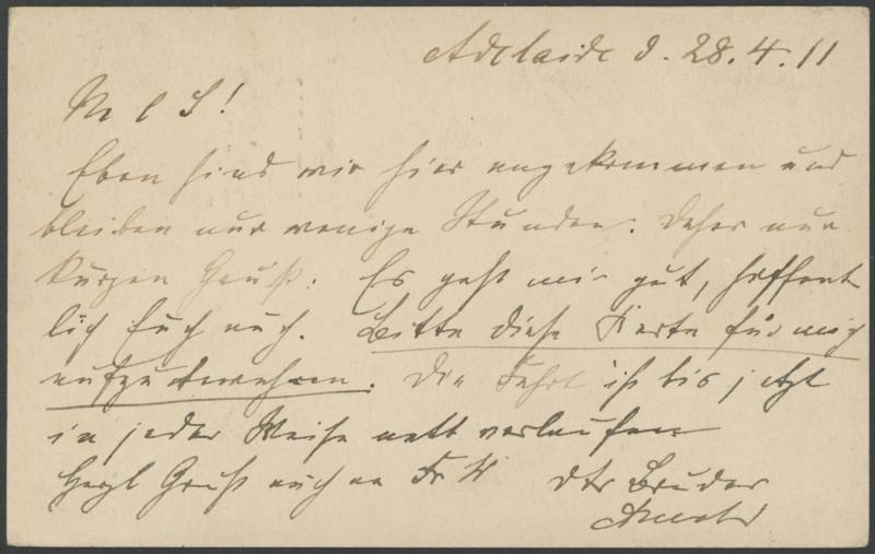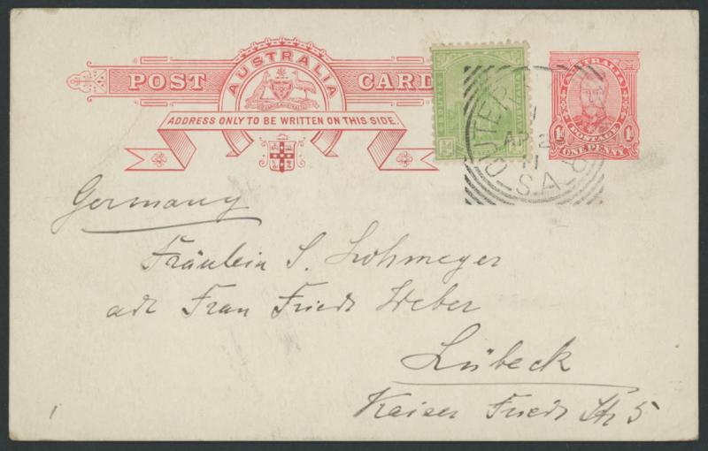 1911 (Apr 28) usage of KGV Fullface 1d Postal Card ACSC P1 to Germany uprated with South Australian ½d Post office tied by 'OUTER