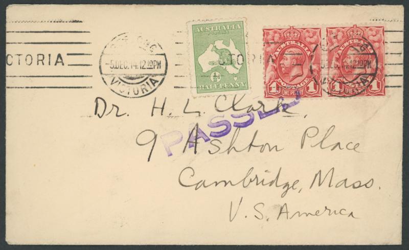 1914 (Dec 5) commercial cover to Massachusetts USA with Two Issue Franking of Kangaroo ½d green and Engraved KGV 1d pair tied by