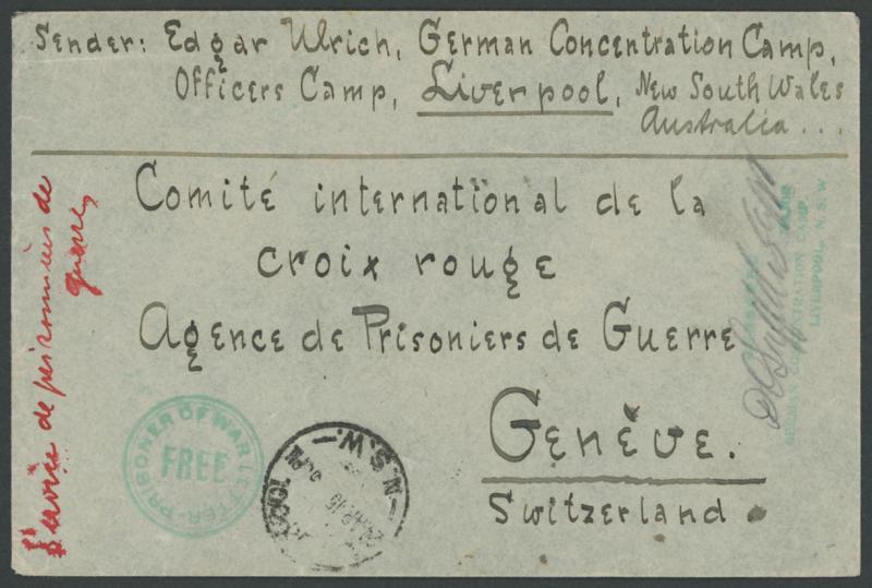 WAR LETTER/ FREE ' and 'CENSORED/...MAJOR/GERMAN CONCENTRATION CAMP/LIVERPOOL NSW' cachets both in green, the latter signed "DO Griffiths Capt" (recorded -.4.1915 to -.05.1915 only), partial Liverpool cds of '24AP15', the reverse with superb '71' in