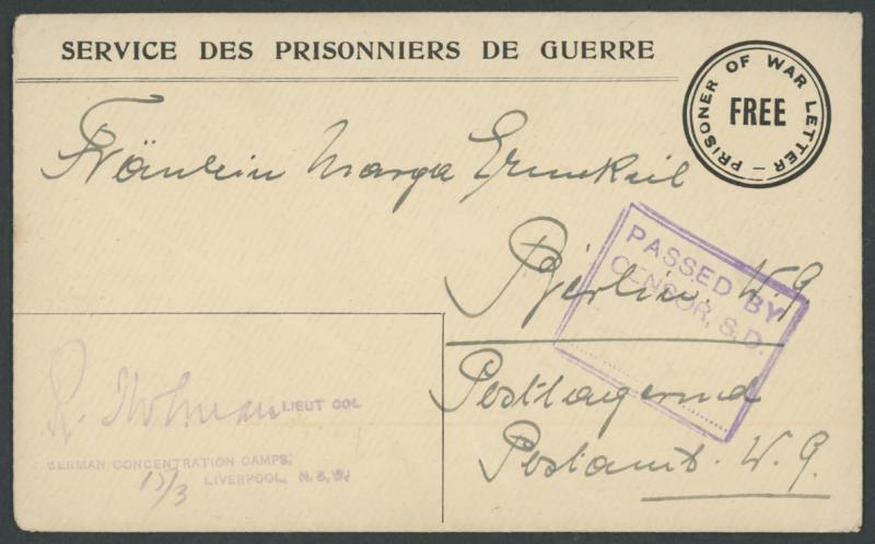 Germany with 'R Holman LIEUT COL/GERMAN CONCENTRATION CAMPS/LIVERPOOL NSW' cachet and boxed 'PASSED BY/CENSOR SD/...' cachet of Sydney both in violet, with the enclosed letter with printed 'CONCENTRATION CAMPS, AUSTRALIA/PRISONER OF WAR LETTER'
