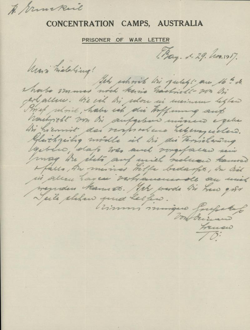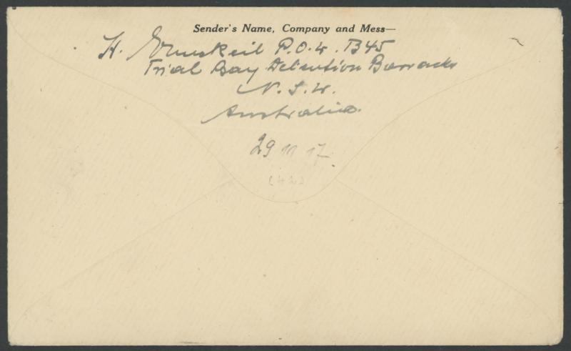 1917 stampless envelope with printed 'PRISONER OF WAR LETTER/ FREE ' endorsed on the flap from "Trial Bay Detention Barracks", to