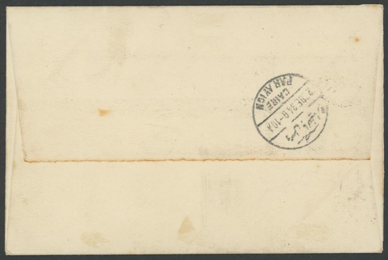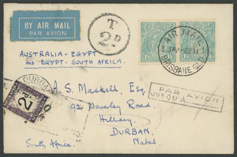 /BRISBANE QLD' cds, Cairo transit backstamp of '22DE34' and boxed 'PAR AVION/JUSQU'A....' handstamp of Cairo, South African 'T/2D'-in-circle handstamp & Postage Due 2d tied by 'DURBAN/29DEC34' cds, insignificant blemishes otherwise superb. The rate