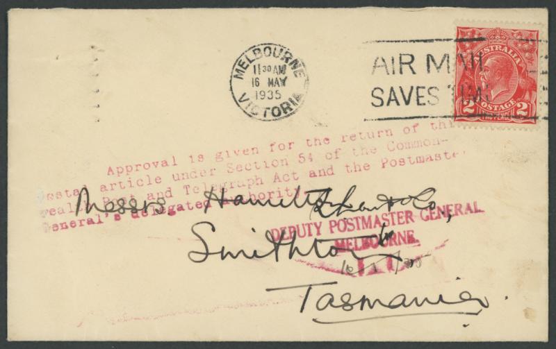 1935 innocuous-looking Colonial Sugar Refinery cover from Melbourne to Tasmania with large and impressive 'Approval is given for