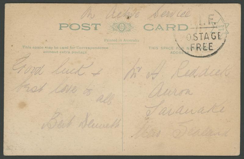 'AIF/POSTAGE/FREE'-in-circle handstamp. Free postage for troops was introduced -.2.1915. (Image1) (Image2)
