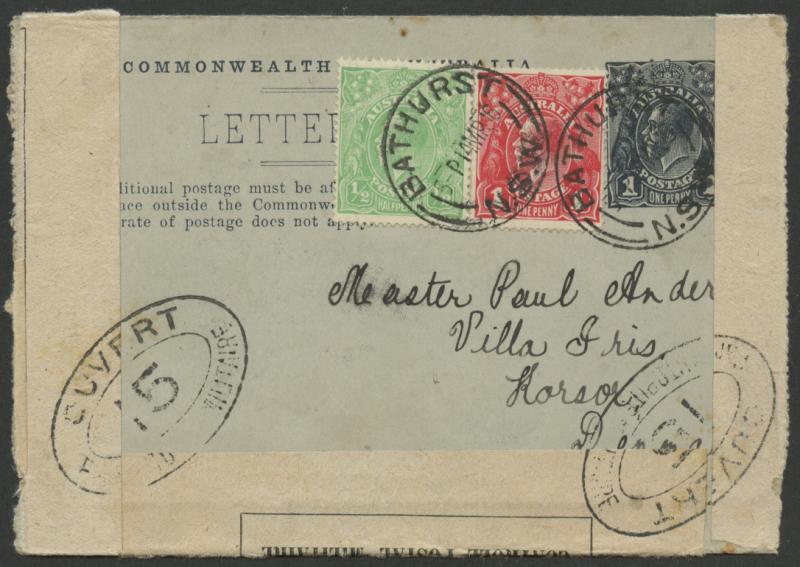 to sit his University of Sydney entrance exams with KGV ½d green & 1d red tied by 'BATHURST/NSW' cds, unusually routed via France where censored with 'CONTROLE POSTAL MILITAIRE' resealing labels affixed on three sides tied by 'OUVERT/15/...' oval
