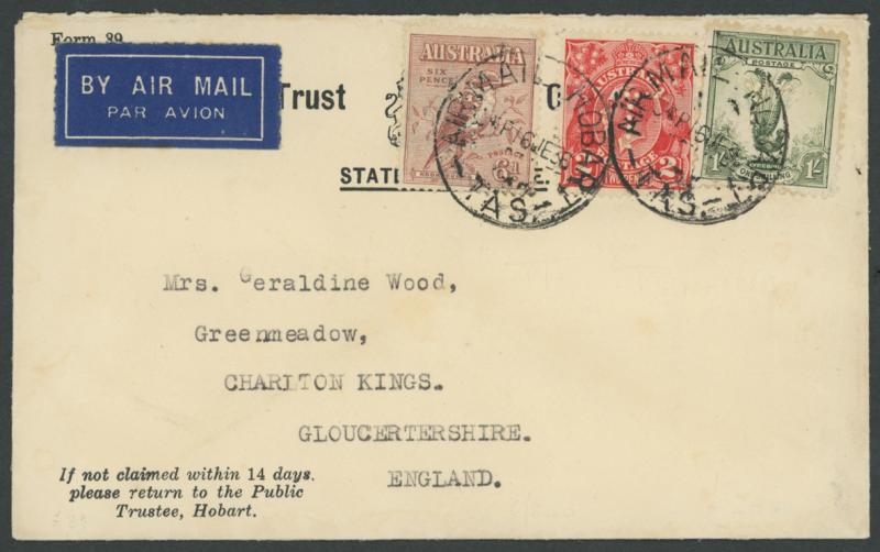 green all punctured 'T' tied by Hobart Airmail cds, a couple of minor blemishes. The QANTAS/Imperial Airways rate to England was 1/6d per ½oz; inexplicably overpaid 2d. (Image1) (Image2)