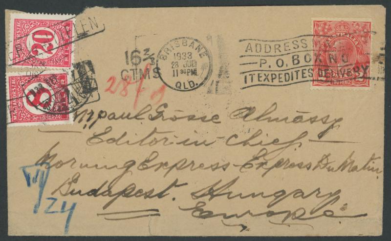 1933 (July 28) envelope to Hungary with KGV 2d red solo tied by Brisbane slogan cancel, taxed with '16 2/3/CTMS' [centimes]