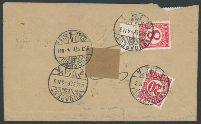 unframed handstamp, on arrival converted to "28f" in red pencil and Hungarian Postage Dues 8f red & 20f red affixed on the face tied by Budapest '933 SEP 4' cds cancels, these invalidated with '...ERVENYTELLEN' boxed handstamps and a further 8f & 20f