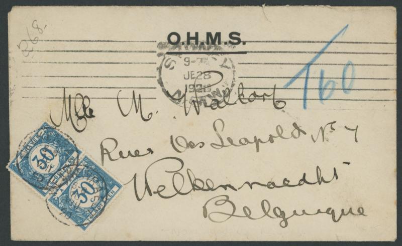 1920 (June 28) plain OHMS envelope without Department imprint or sender's details, unfranked to Belgium with Sydney continuous