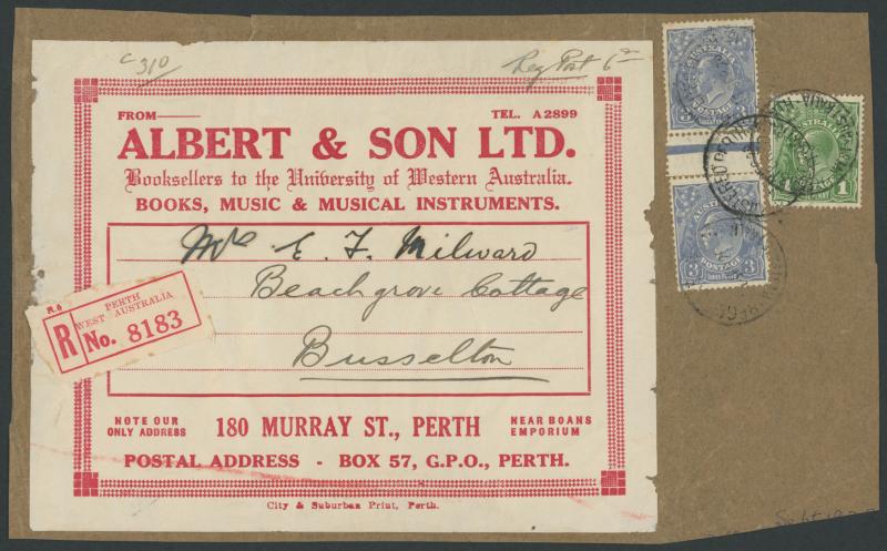 to Busselton, WA with KGV 1d green & 3d blue x2 tied by Perth Registered cds cancels alongside and red R label, minor blemishes. The rate was quadruple 1d per 8oz book post plus 3d registration fee. The separate book post rate was subsumed under