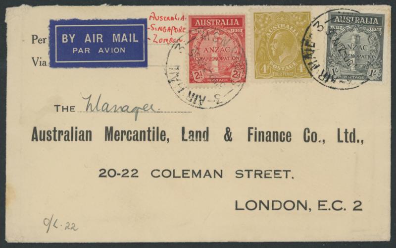 Singapore - London" airmail, ANZAC 2d red & 1/- black (ACSC 165; Cat $400 on cover) plus KGV 4d olive tied by Sydney Airmail cds cancels, light horizontal fold clear of the adhesives & a few minor blemishes. The rate was 1/6d per ½oz airmail