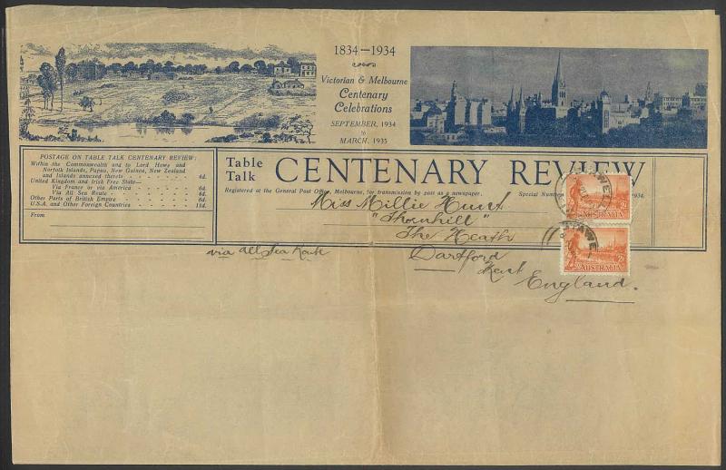 1934 (Aug 21) usage of complete 'Table Talk Centenary Review' illustrated newspaper wrapper (380x460mm) with views of Melbourne in