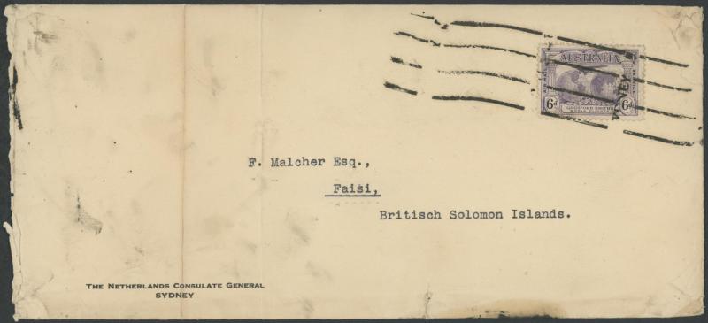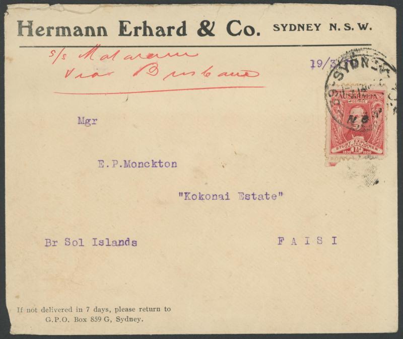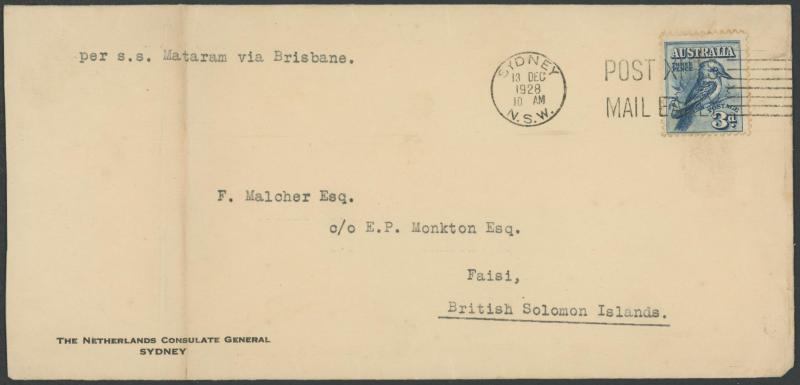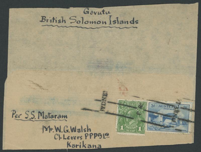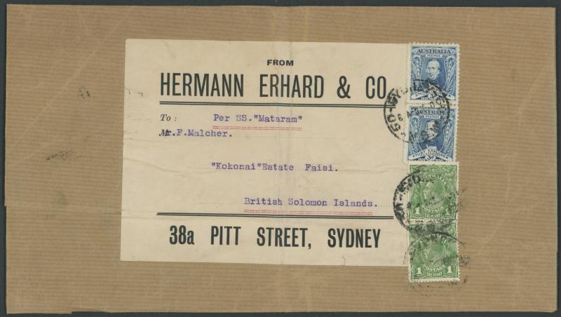 Estate, Faisi, British Solomon Islands" endorsed "Per SS Mataram" with KGV 1d green x2 & Sturt 3d blue x2 tied by Sydney cds cancels, vertical fold through the address label not affecting the stamps or markings and some other bends. The rate was