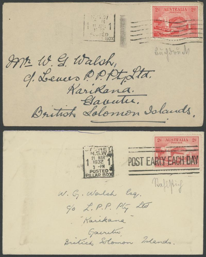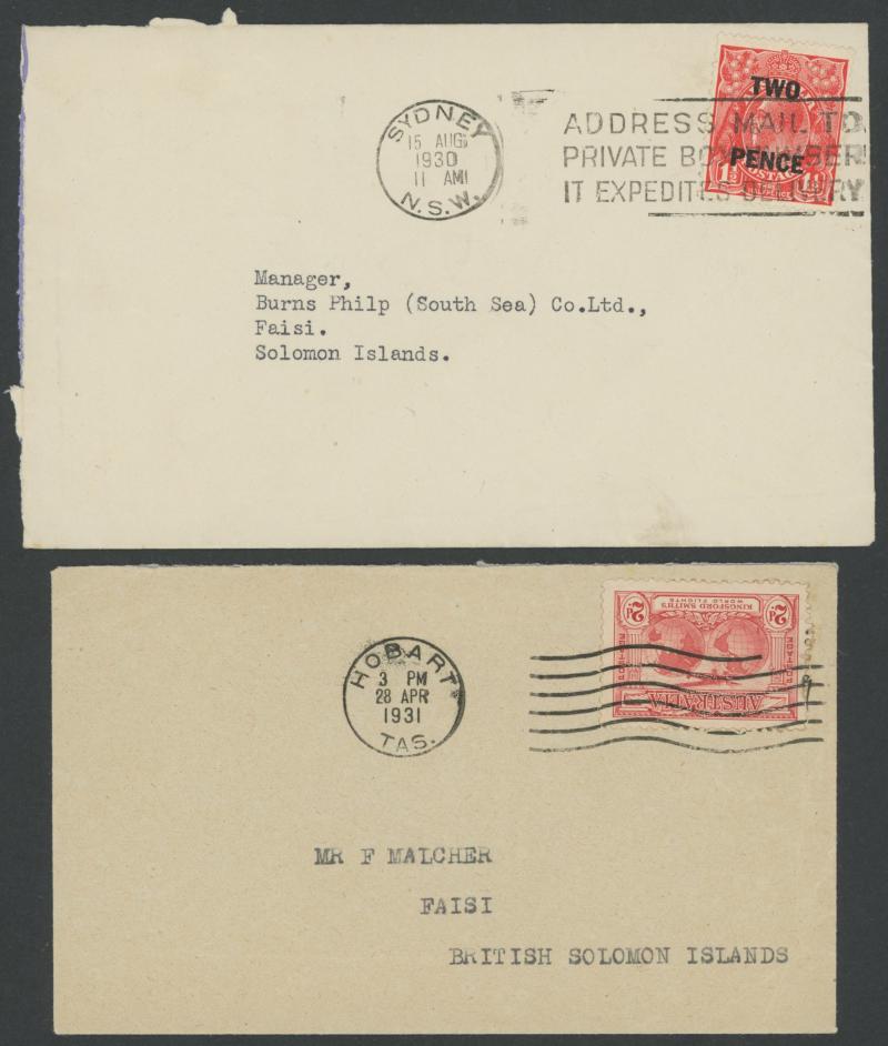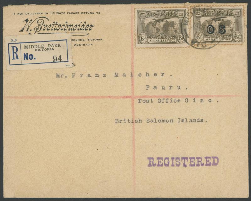 the adhesives), also 1931 Brettschneider stamp dealer envelope registered to "Pauru, Post Office Gizo" with Airmail 6d brown & 'OS' Overprint (small closed tear) and a private newspaper wrapper "c/- Levers PP PtyLtd, Karikana, Gavutu" with KGV 1d