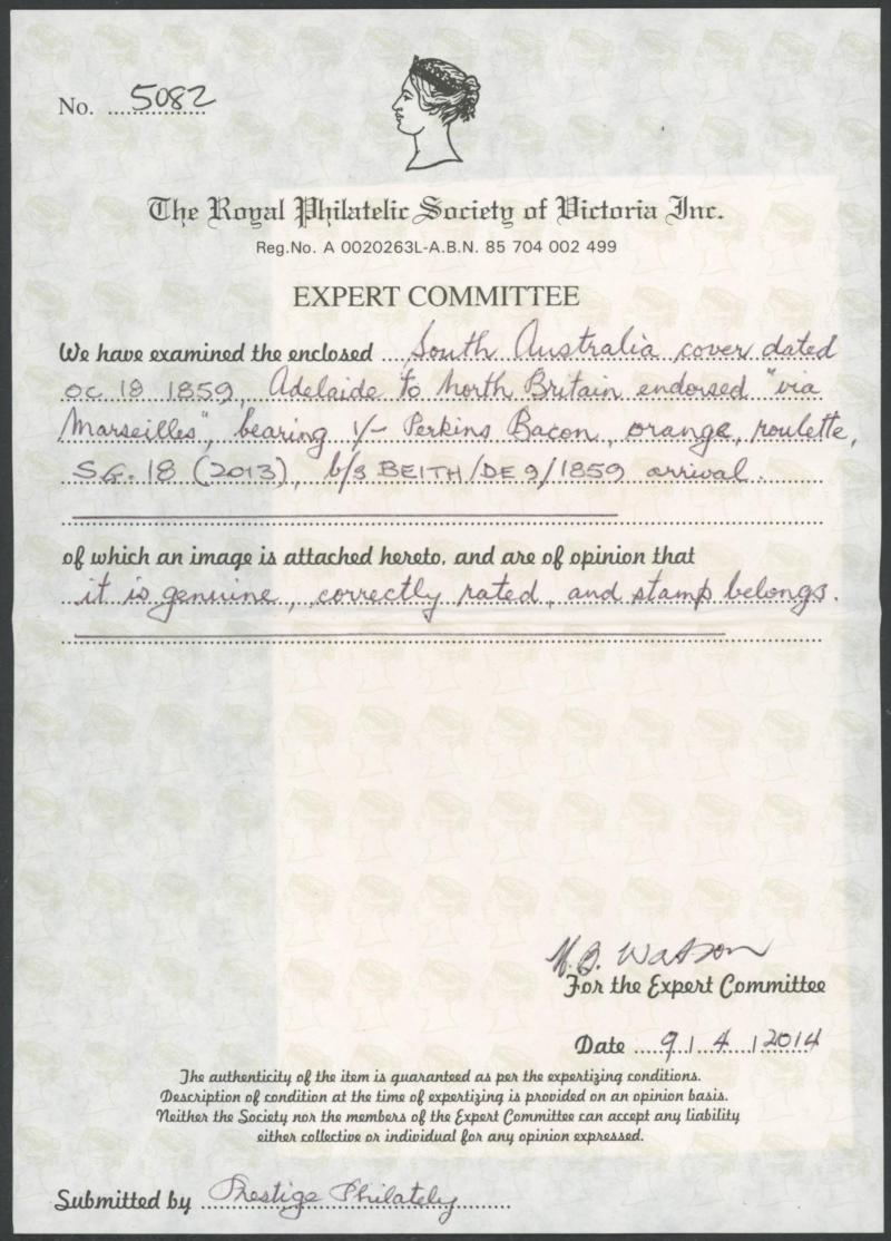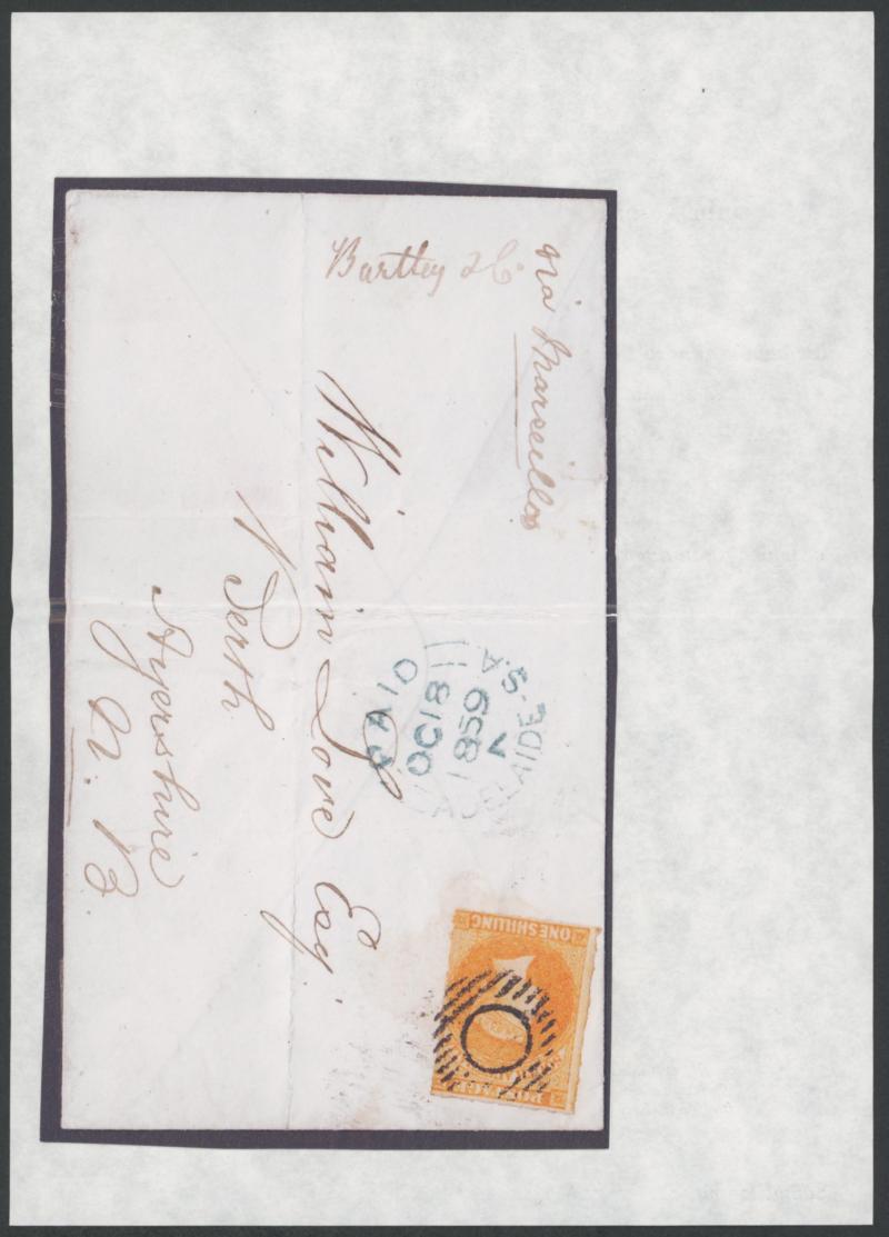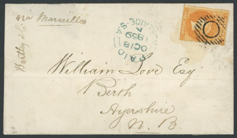 circle-in-bars cancel, 'PAID/=ADELAIDE-S.A.=' cds in blue, 'BEITH/DE9/1859' arrival backstamps, ironed-out vertical & horizontal creases well clear of the stamp. A very rare franking. Ex Wise (1943), Bernhard Forster, Barton Sparrow and Michael