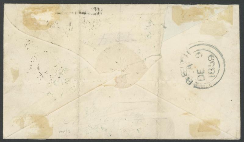 complete Adelaide 'G.P.O/JA*6/1851/ SOUTH AUSTRALIA' crowned oval in blue all on the face, fair 'GEELONG/JA*17/1851/PORT PHILLIP' crowned oval arrival in black on the reverse, repaired faults & large-part back flap missing. Carried by 'Aztec'