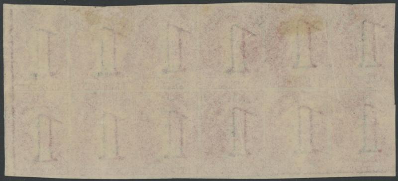 1857-67 QV Chalons Double-Lined Numerals Watermark 1d carmine SG 29 block of 12 (6x2), uneven margins (framelines shaved in