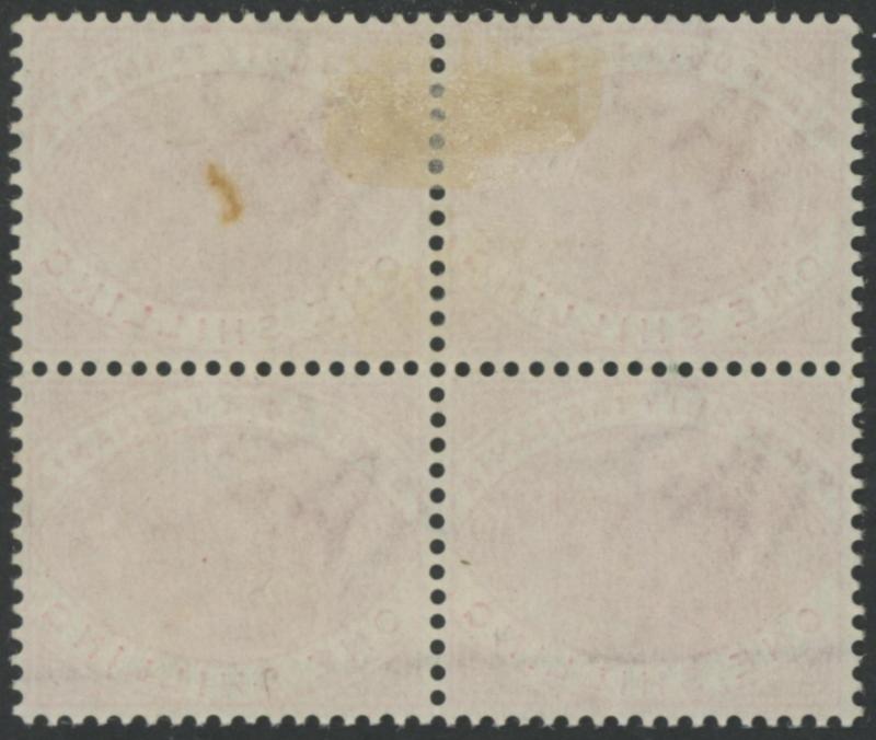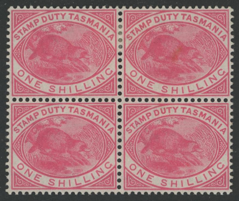POSTAL FISCALS: 1880 Platypus 1/- rosine SG F29 block of 4, the upper-units with a hinge remainder, the lower units unmounted, Cat