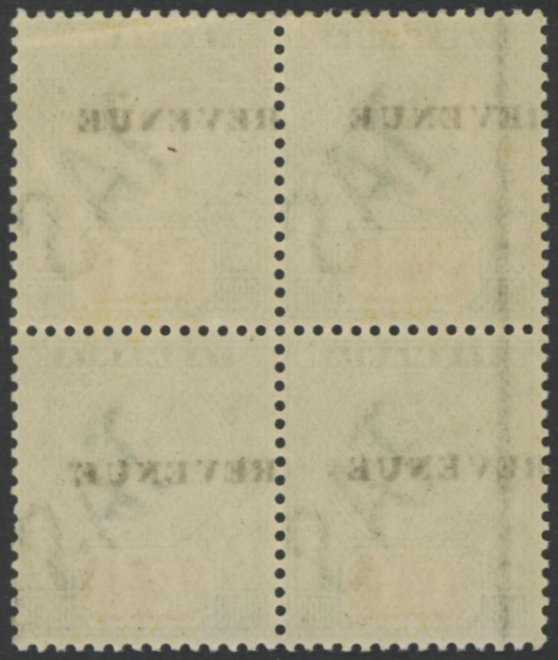 POSTAL FISCALS: 1900 'REVENUE' Overprint on QV Tablets £1 green & yellow-orange SG F39 block of 4, minor bends on the upper units,