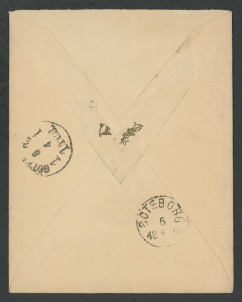 'GOTEBURG/6/4/1890' cds arrival backstamps, back flap missing not affecting the markings. A very scarce destination: Don Pearce's collection did not contain any pre-UPU mail to Sweden, nor to any other Scandinavian country. (Image1) (Image2)