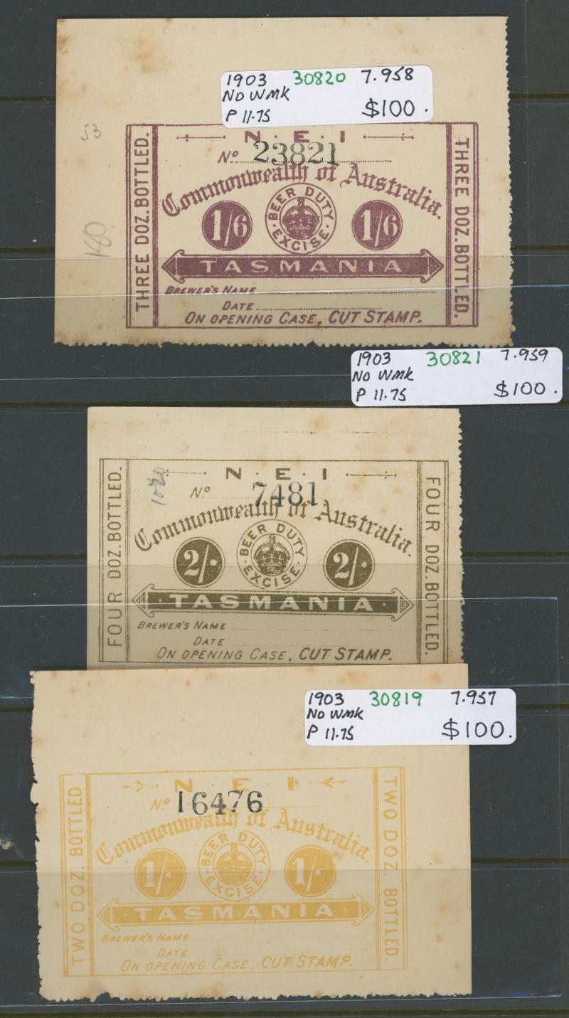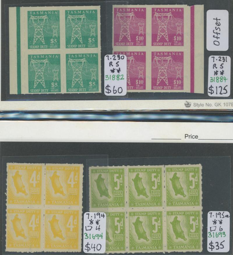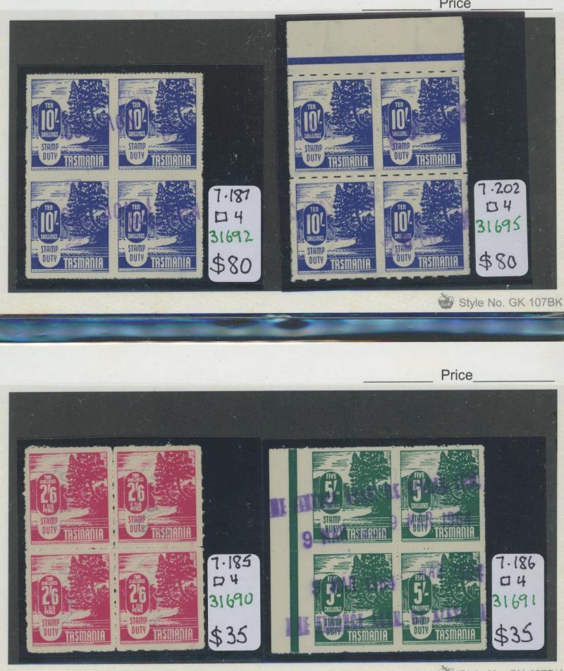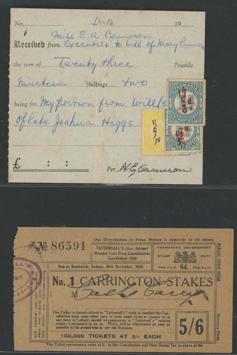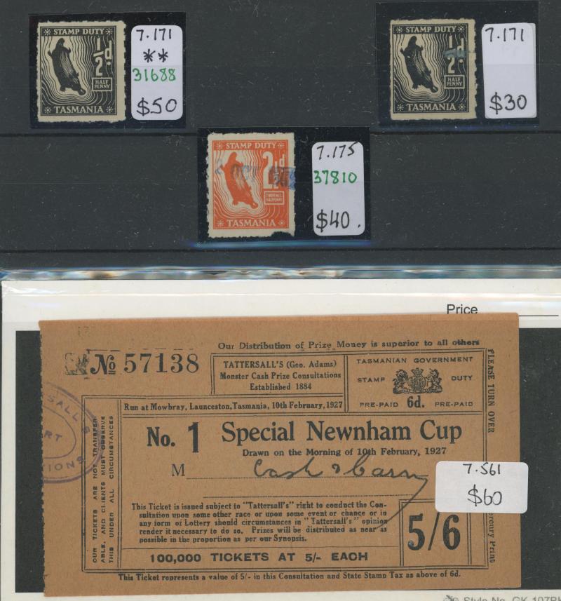of 4 of the 2/6d 5/- & 10/- x2, and Decimals with multiples including $5 & $10 ** blocks of 4, also a page of Impressed Duty cutouts, printed '.../PRE-PAID 6d PRE-PAID' on eight different Tattersall's 5/6d sweepstakes tickets, huge Bottled Beer Duty