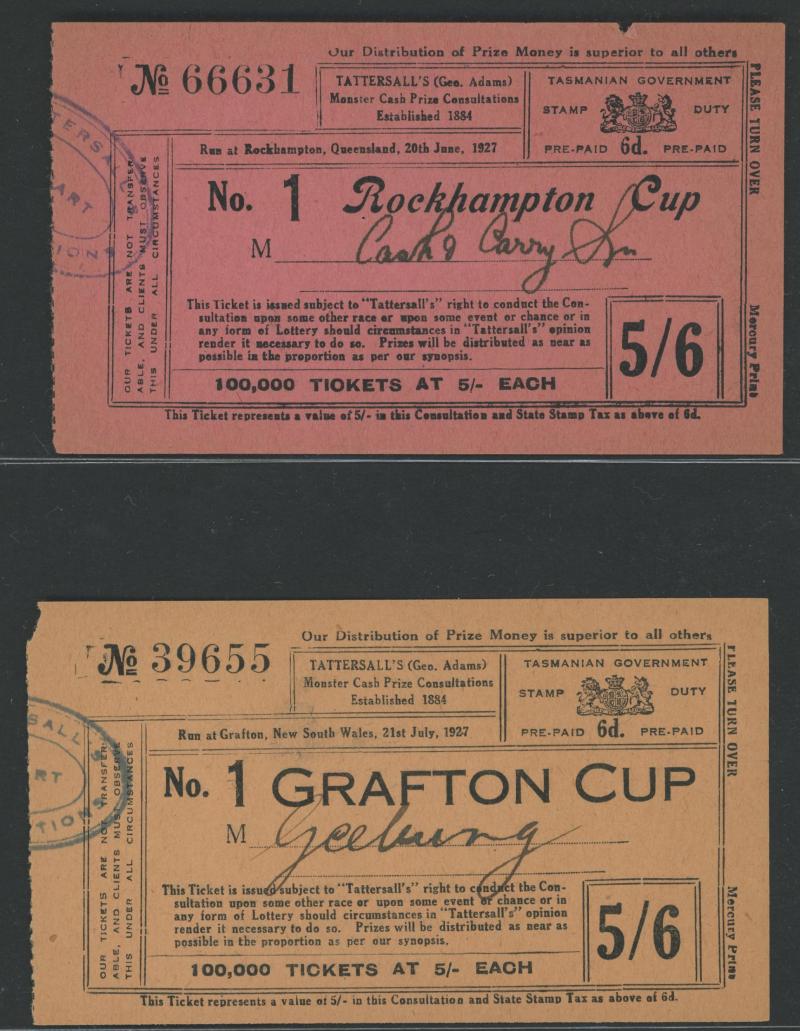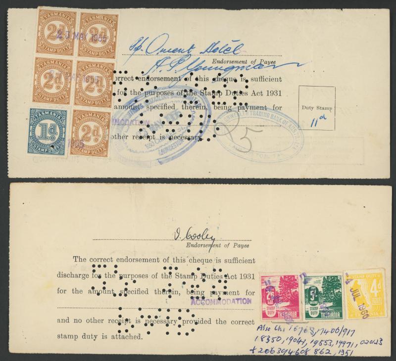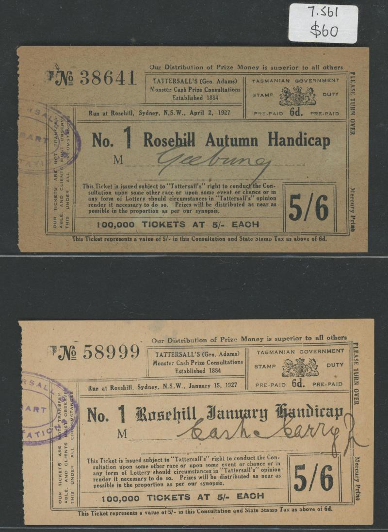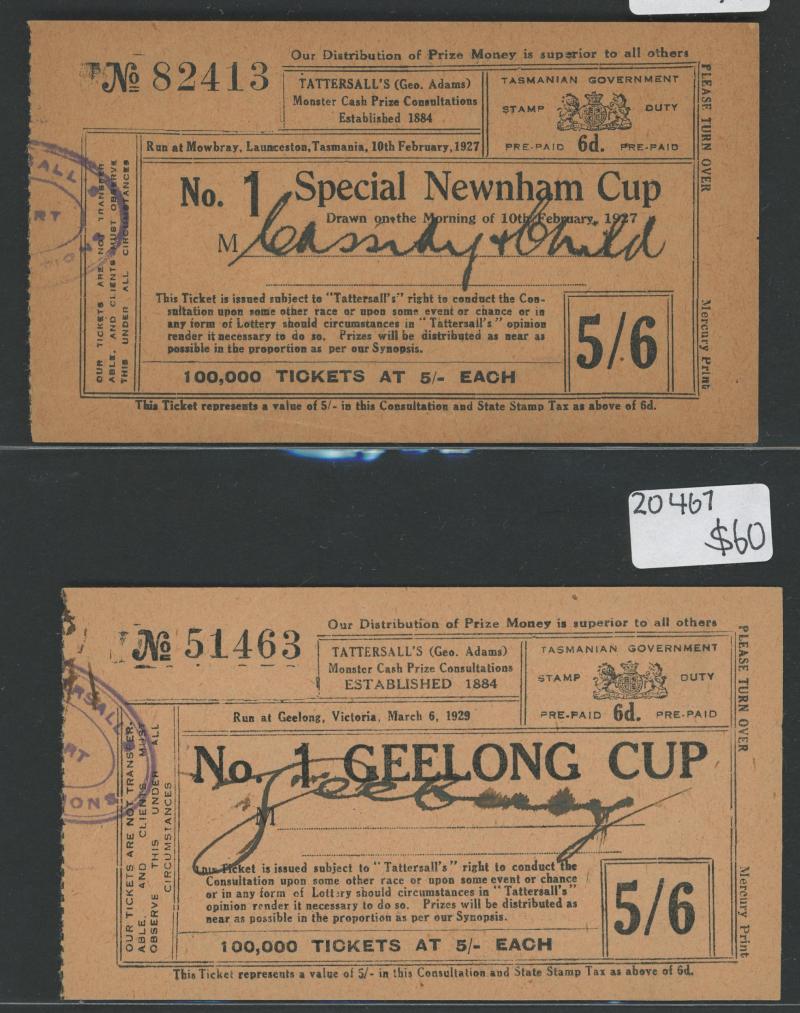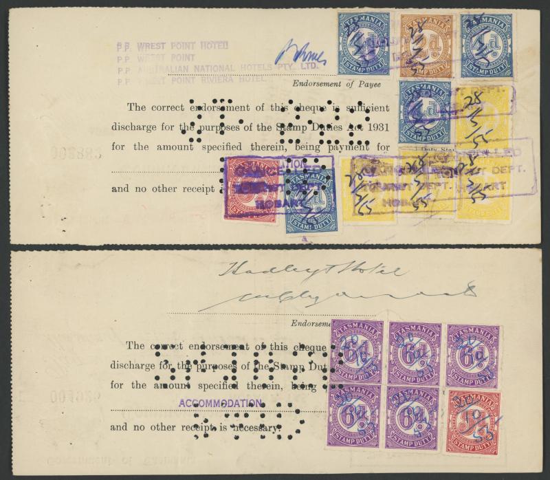 of 4 of the 2/6d 5/- & 10/- x2, and Decimals with multiples including $5 & $10 ** blocks of 4, also a page of Impressed Duty cutouts, printed '.../PRE-PAID 6d PRE-PAID' on eight different Tattersall's 5/6d sweepstakes tickets, huge Bottled Beer Duty