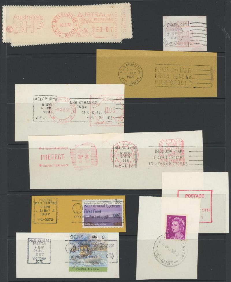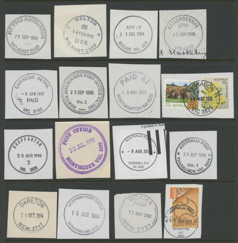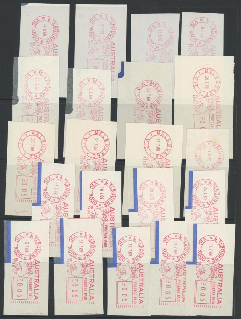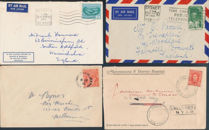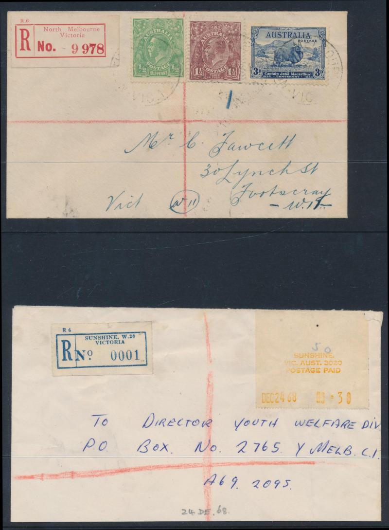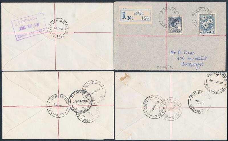 1963-73 John Webster registereds from '14TH STREET MILDURA', 'ARMSTRONG'S', 'BROWNS PLAINS', 'CASHMORE', 'CANNIE', 'CHETWYND' and 'CLARENDON', also 'RELIEF/ 7MY54/No15' with "Mildura/Mil PO" on blank R label, 1950 with 'BOLTON/VIC-AUST' on the face,