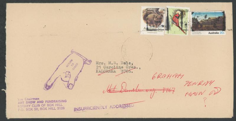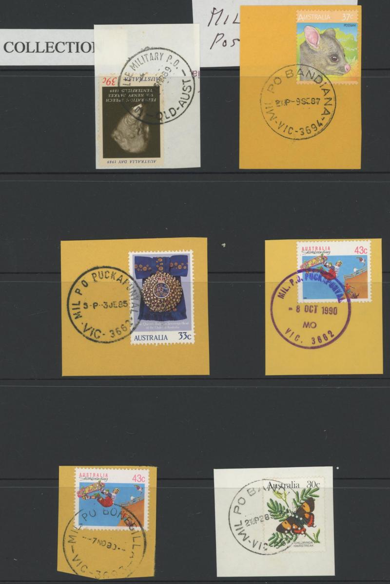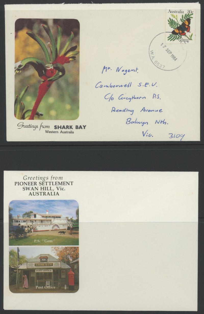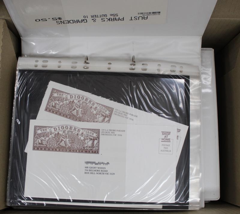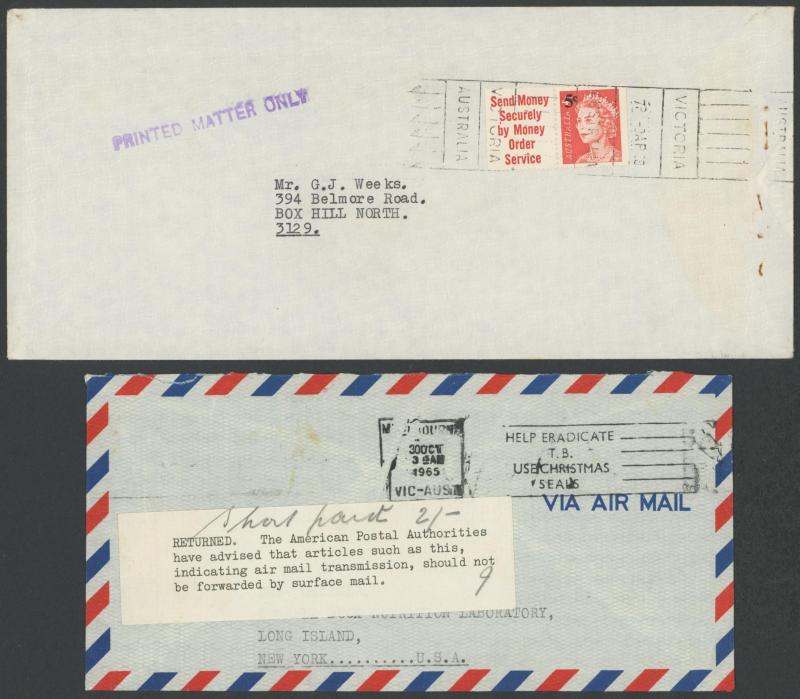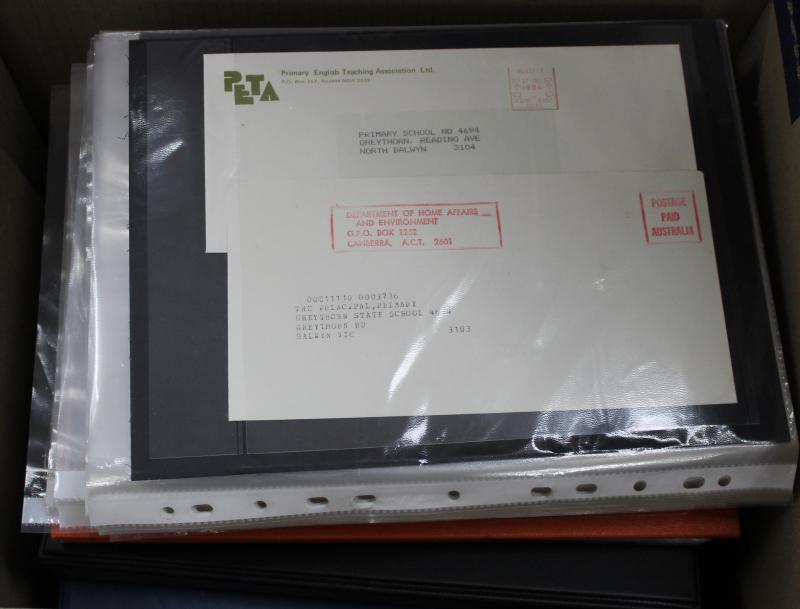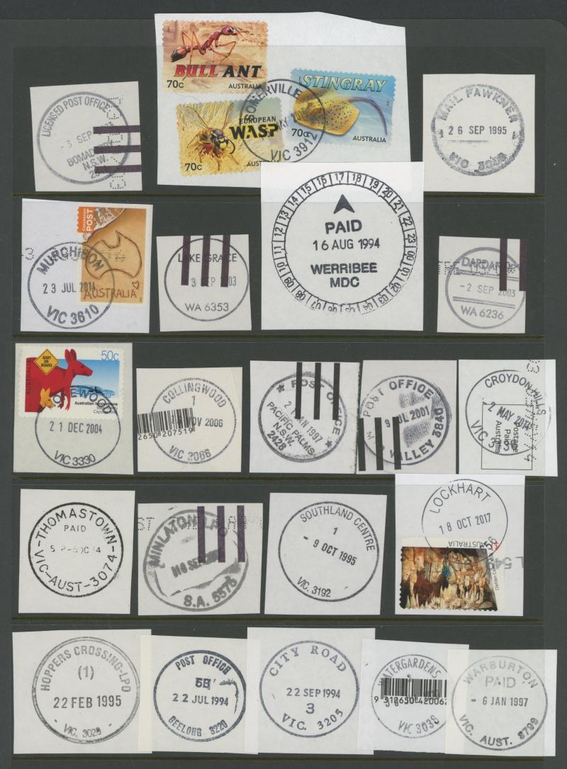 1963-73 John Webster registereds from '14TH STREET MILDURA', 'ARMSTRONG'S', 'BROWNS PLAINS', 'CASHMORE', 'CANNIE', 'CHETWYND' and 'CLARENDON', also 'RELIEF/ 7MY54/No15' with "Mildura/Mil PO" on blank R label, 1950 with 'BOLTON/VIC-AUST' on the face,