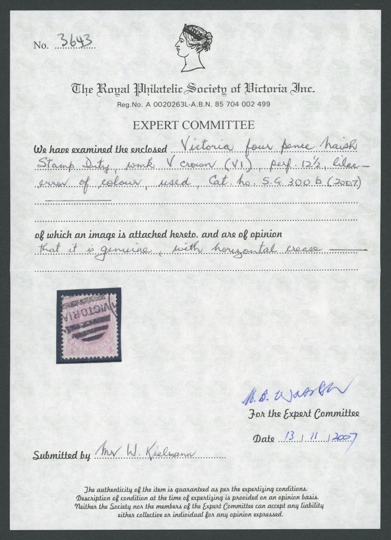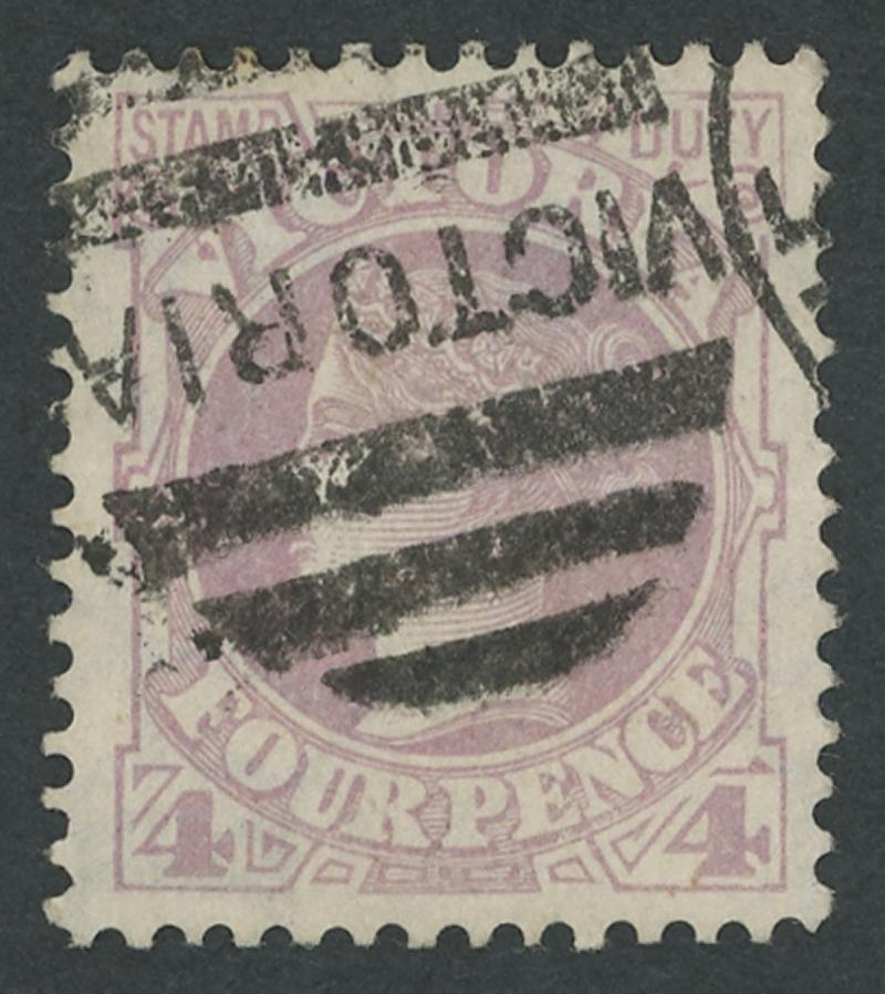 1885-95 QV Naish Designs with 'STAMP DUTY' V/Crown Wmk (Wmk '33') 4d lilac Error of Colour SG 300b, an unusually large