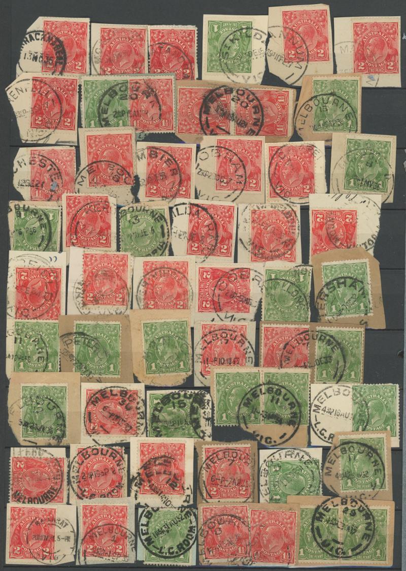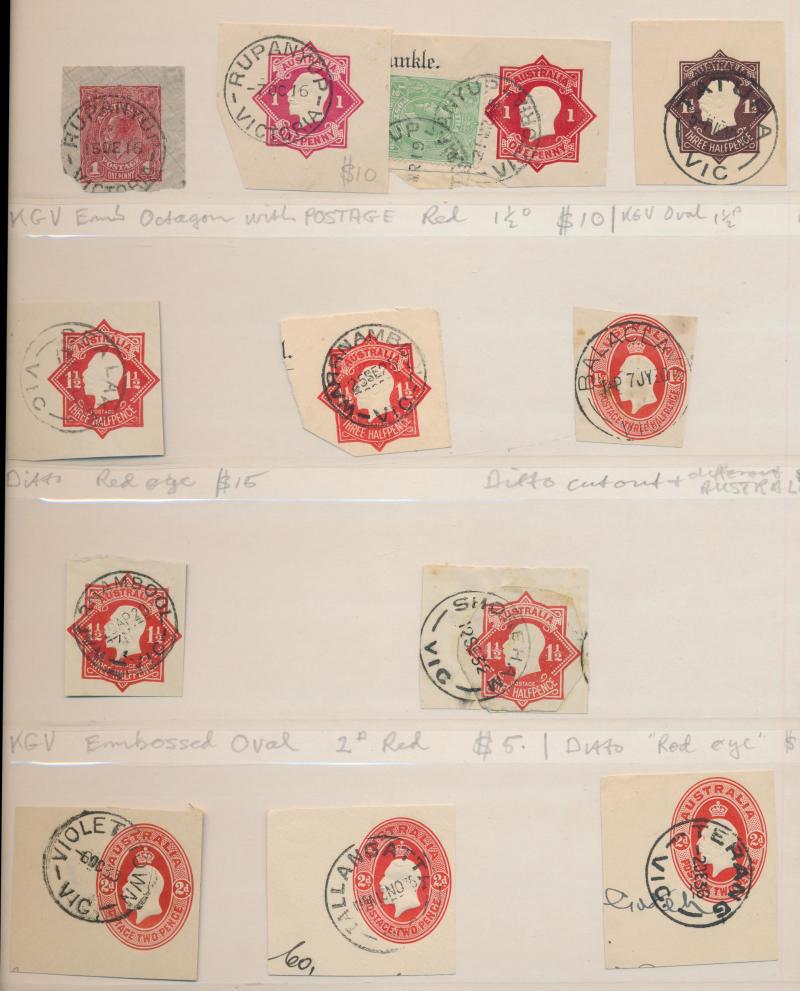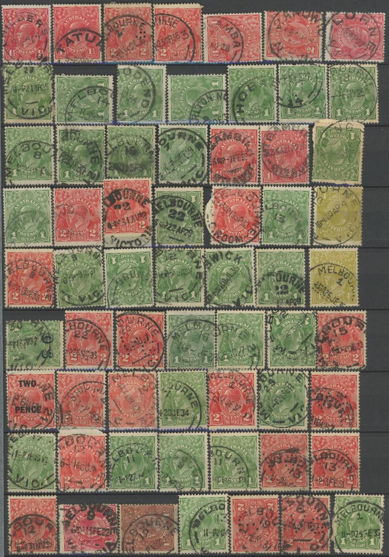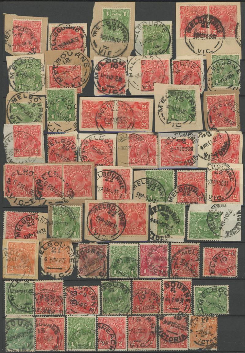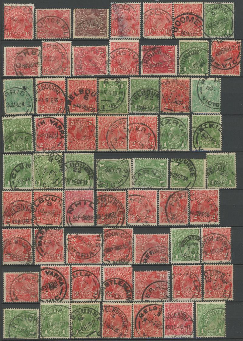 Better range about half on KGV Heads including 'AUST JAMBOREE FRANKSTON', '___ HOMEBUSH LOWER' ('TO' removed, on-piece with R