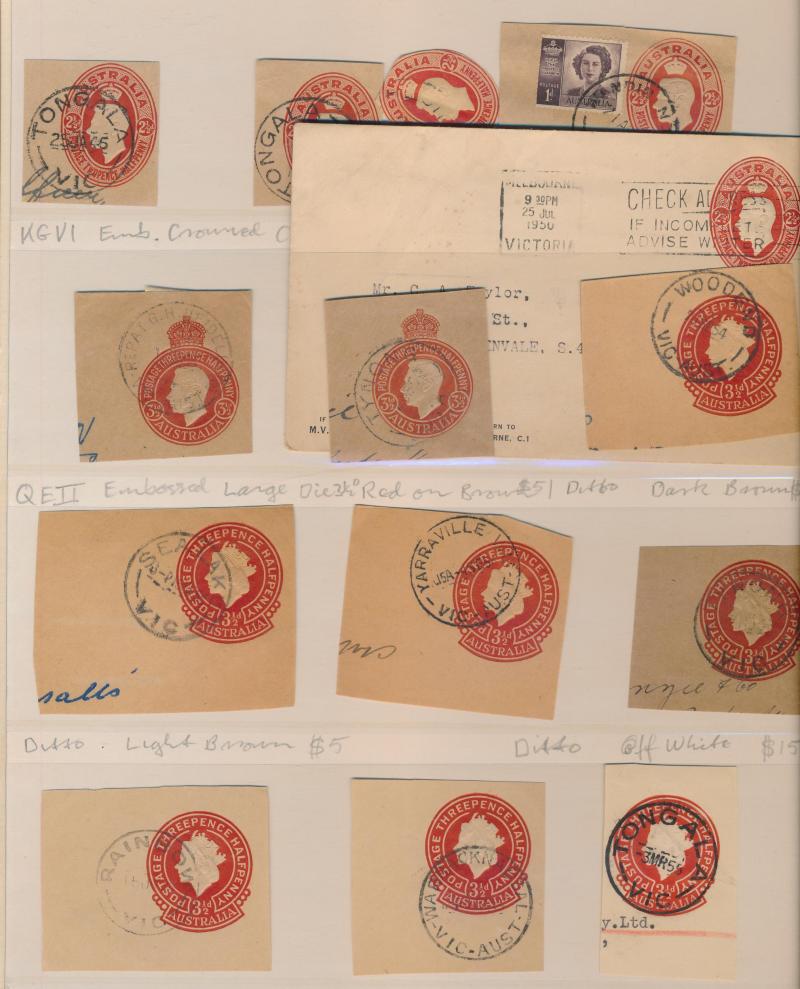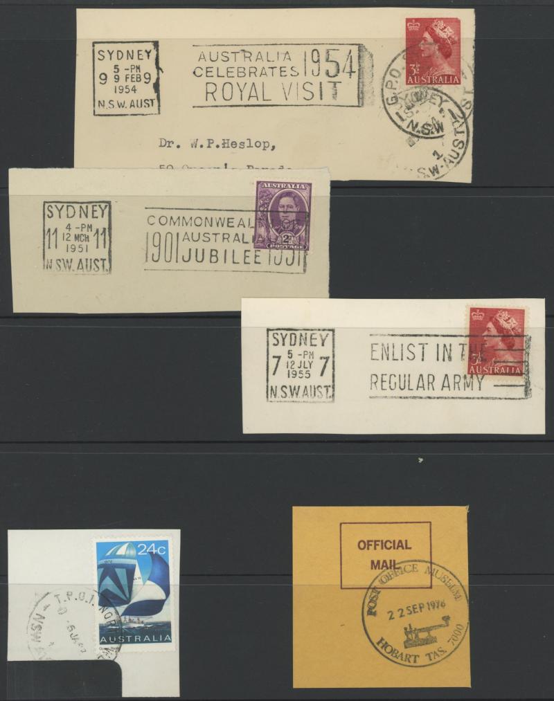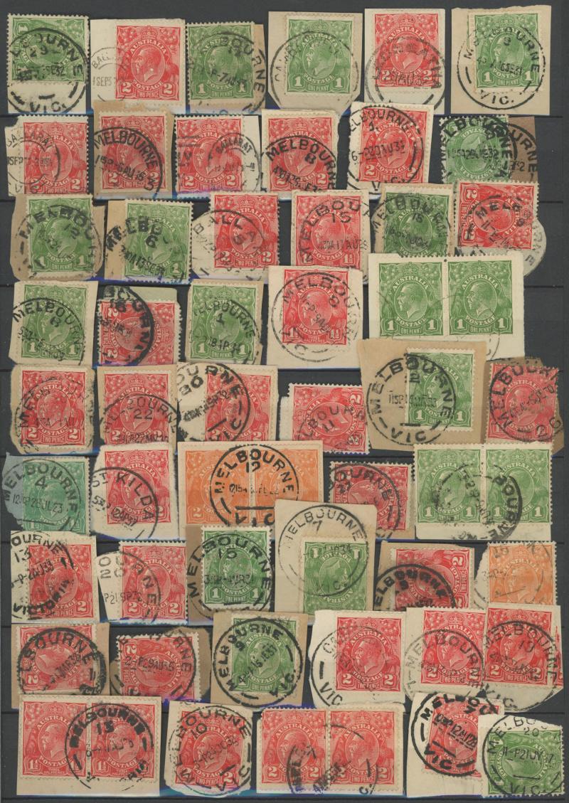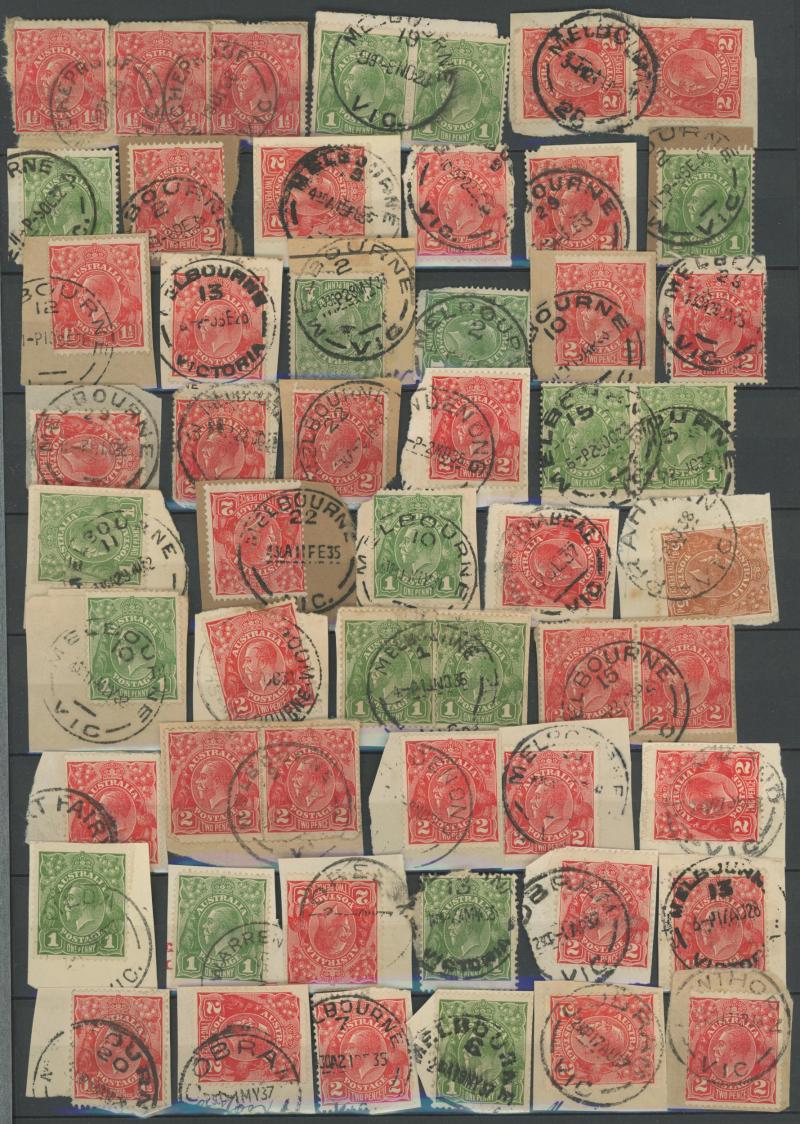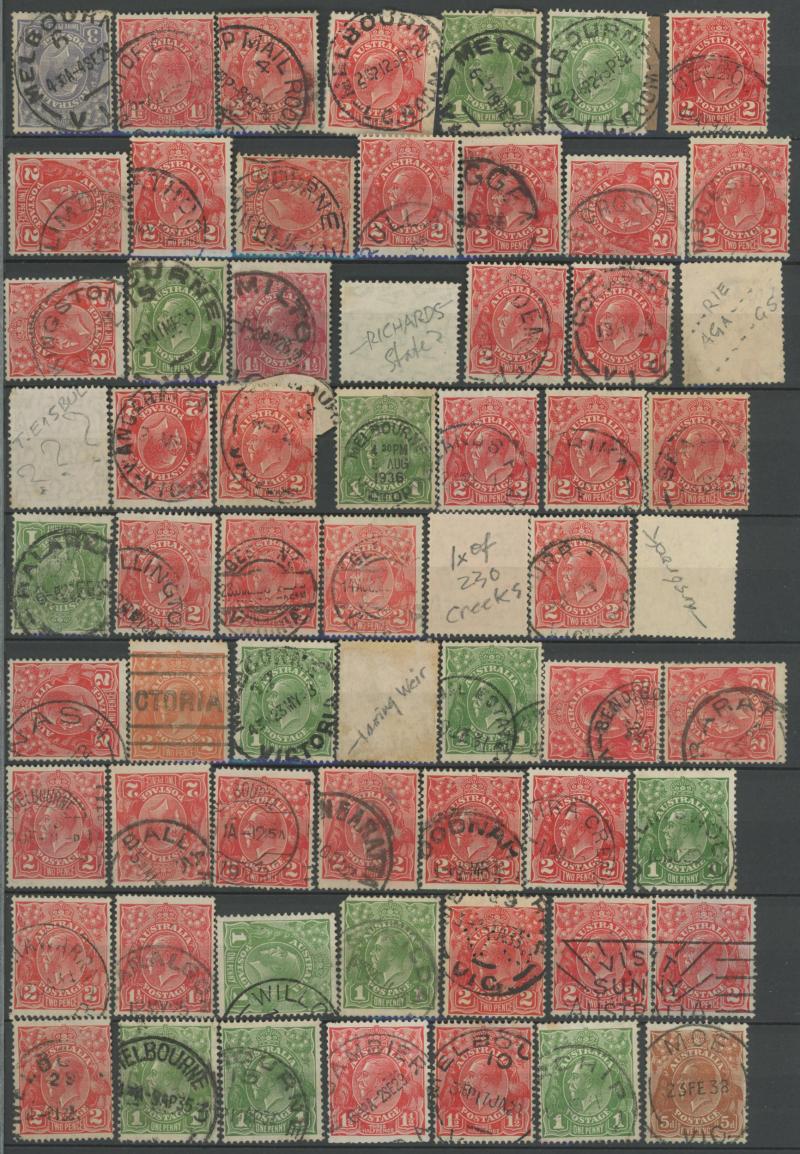 Better range about half on KGV Heads including 'AUST JAMBOREE FRANKSTON', '___ HOMEBUSH LOWER' ('TO' removed, on-piece with R
