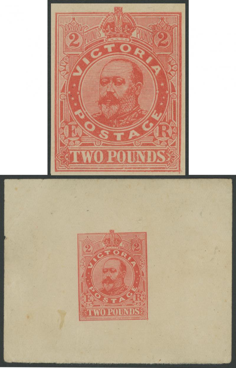 1901-10 'POSTAGE' V/Crown KEVII £2 die proof in rose-carmine on ungummed unwatermarked paper (76x62mm) ACSC V135(DP)2B, creased at
