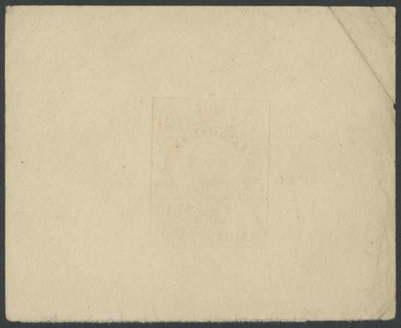 upper-left well clear of the impression, light soiling, Cat $6000 (down from $15,000 in the 2004 edition). Ex Samuel Reading, JRW Purves and Rodney Perry. The ACSC records two examples of this proof and only five others (two in blue). (Image1) (Image2)
