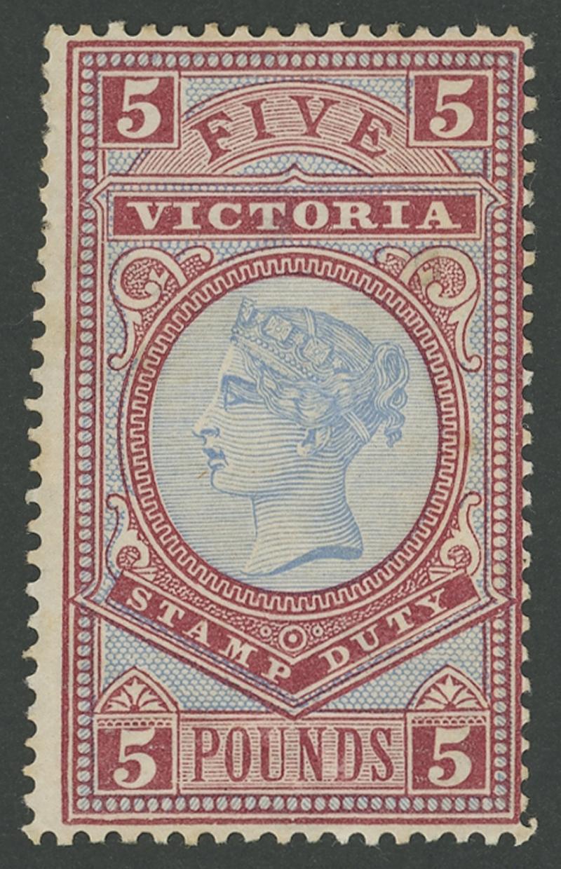 1886-96 QV Fergusson & Mitchell £5 pale blue & maroon SG 324, excellent colours & well-centred, a couple of short perfs at left,