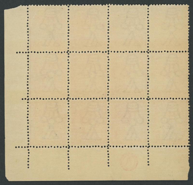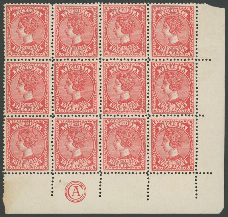 a block of 12 (4x3) from the lower-right of the sheet ACSC V114aza, exceptional centring, unmounted, Cat $1200+ for a mounted monogram strip plus nine unmounted singles. Superb. A rare multiple. (Image1) (Image2)