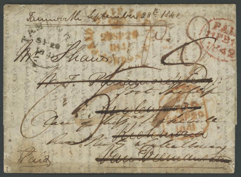fine 'TAMWORTH' unframed despatch cds in black and London 'PAID' tombstone & 'PAID SHIP LETTER' crowned oval datestamps both in red on the face, light Hobart 'SHIP LETTER/28JA28/1842' boxed arrival datestamp in black on the reverse, re-directed to