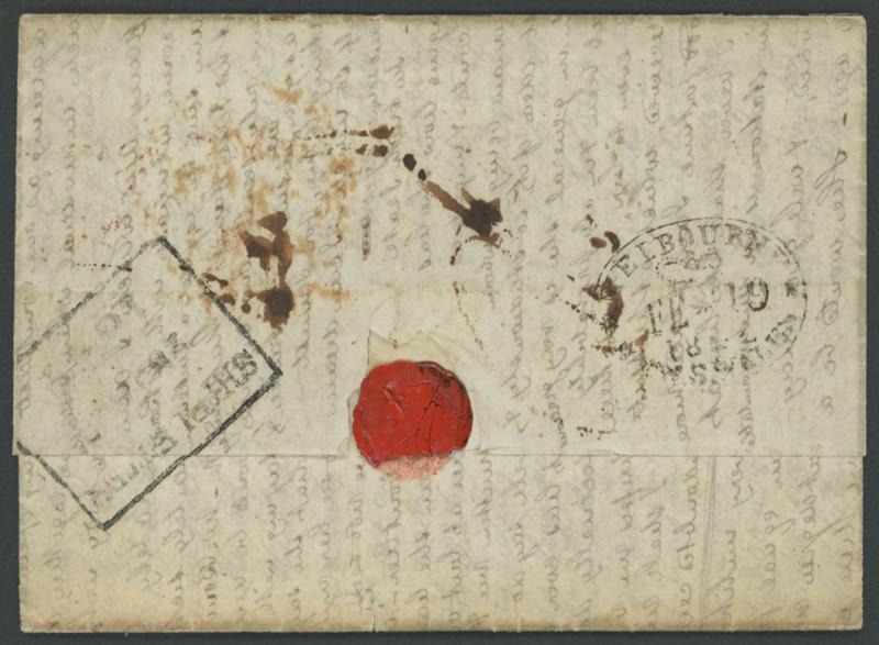 'River Plenty nr Melbourne, Port Phillip" with very fine large-part Hobart 'PAID/11FE11/1842' oval datestamp on the face rated "6"[d] and similar complete 'MELBOURNE/FE*19/1842/NSW S. WALES' framed crowned-oval datestamp on the reverse where rated