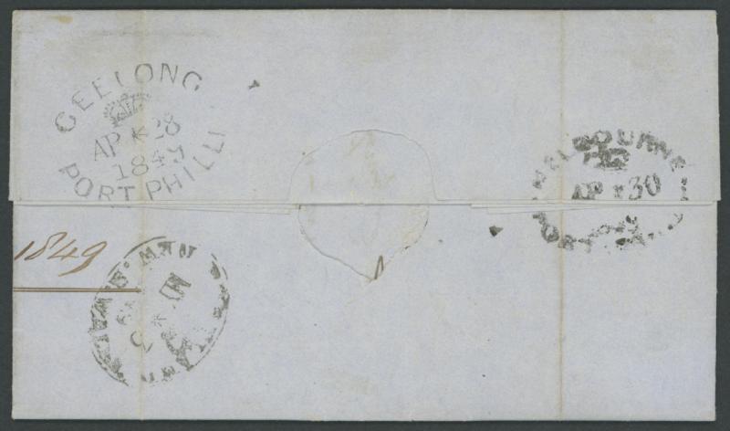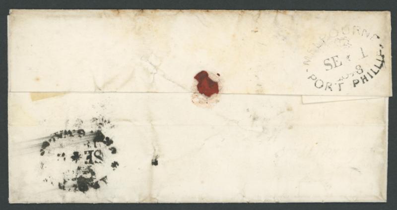 PHILLIP' unframed crowned oval transit & largely fine 'PORTLAND/JY*16/NEW S. WALES' framed crowned oval arrival backstamps, vertical fold slightly affecting the wafer, small edge faults affecting the base of the Sydney marking & some mostly light
