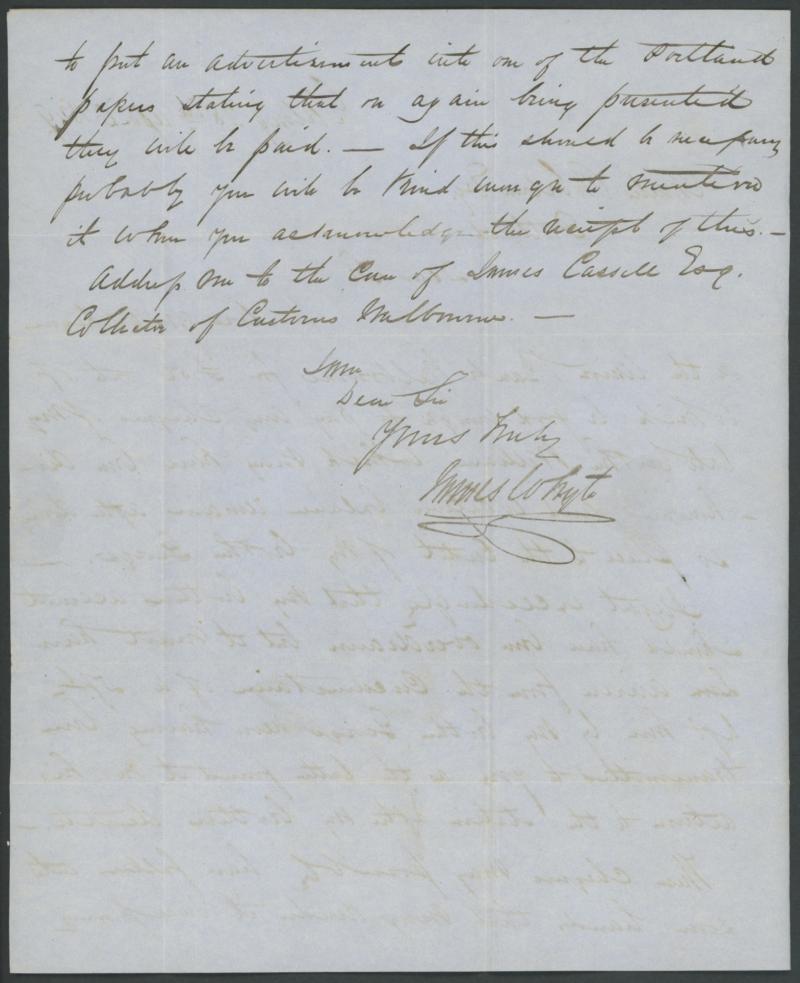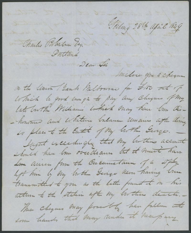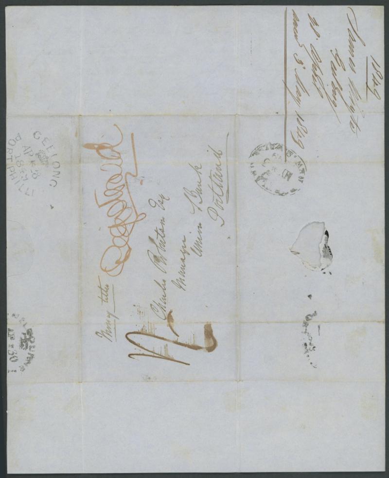 1849 (April 28) entire headed 'Geelong' signed 'James Whyte', to 'Charles Robertsopn Esq, Manager, Union Bank, Portland' endorsed