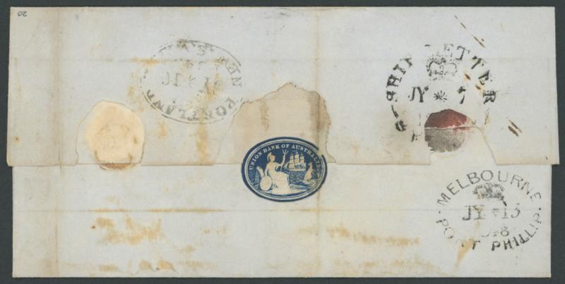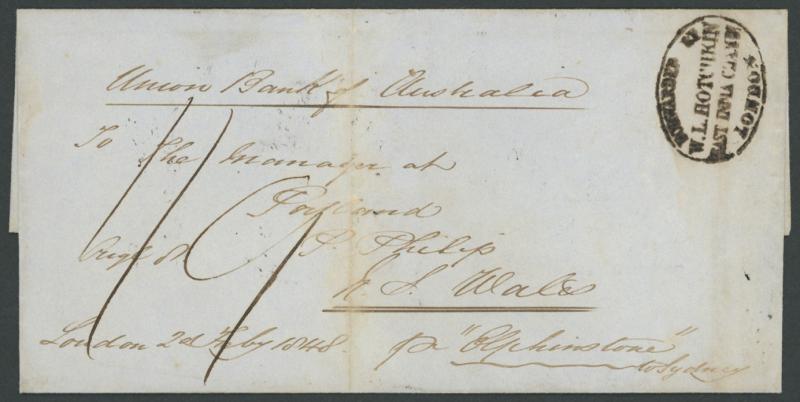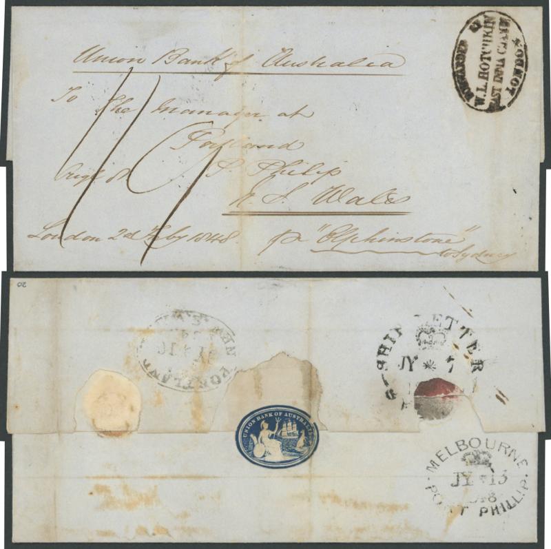 1848 (Feb) stampless outer from England to "Union Bank of Australia, Manager, Portland, P. Philip, N.S.Wales" sealed on the reverse