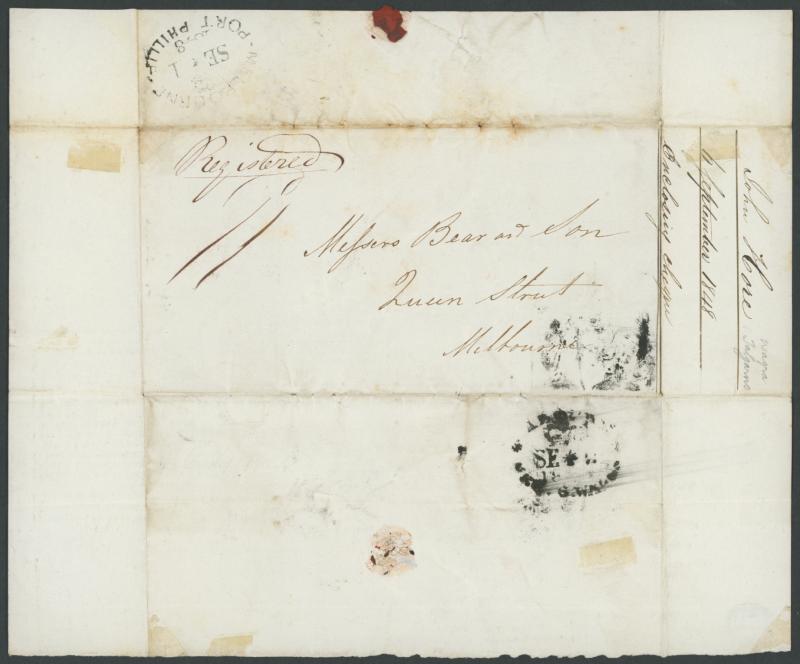 'Money letter' (the Tasmanian terminology) with 'Registered' (the Victorian term) added later in red, rated '1/-' in black for carriage between 230 & 300 miles, very fine complete 'GEELONG/PORT PHILLIP' unframed crowned oval despatch, 'MELBOURNE/PORT