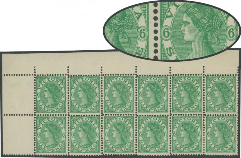1901 QV Amended Designs without 'POSTAGE' V/Crown Watermark QV 6d emerald SG 380 block of 12 (6x2) from the upper-left corner of