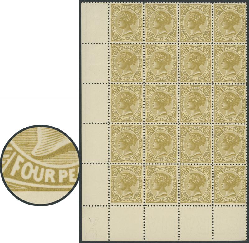 V91a) block of 20 (4x5) from the lower-left corner of the sheet, the lower-left unit with 'OU' of 'FOUR' Joined #V91g, generally well-centred, a few minor gum bends, unmounted, Cat $345 for mounted singles (£300+ for mounted normal singles). (Image1)