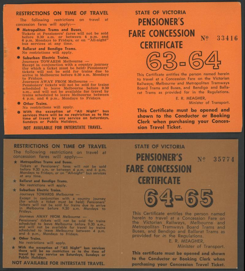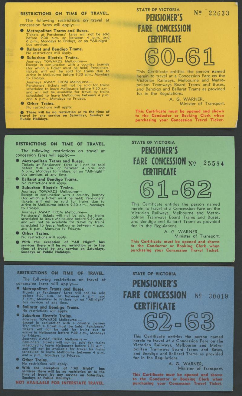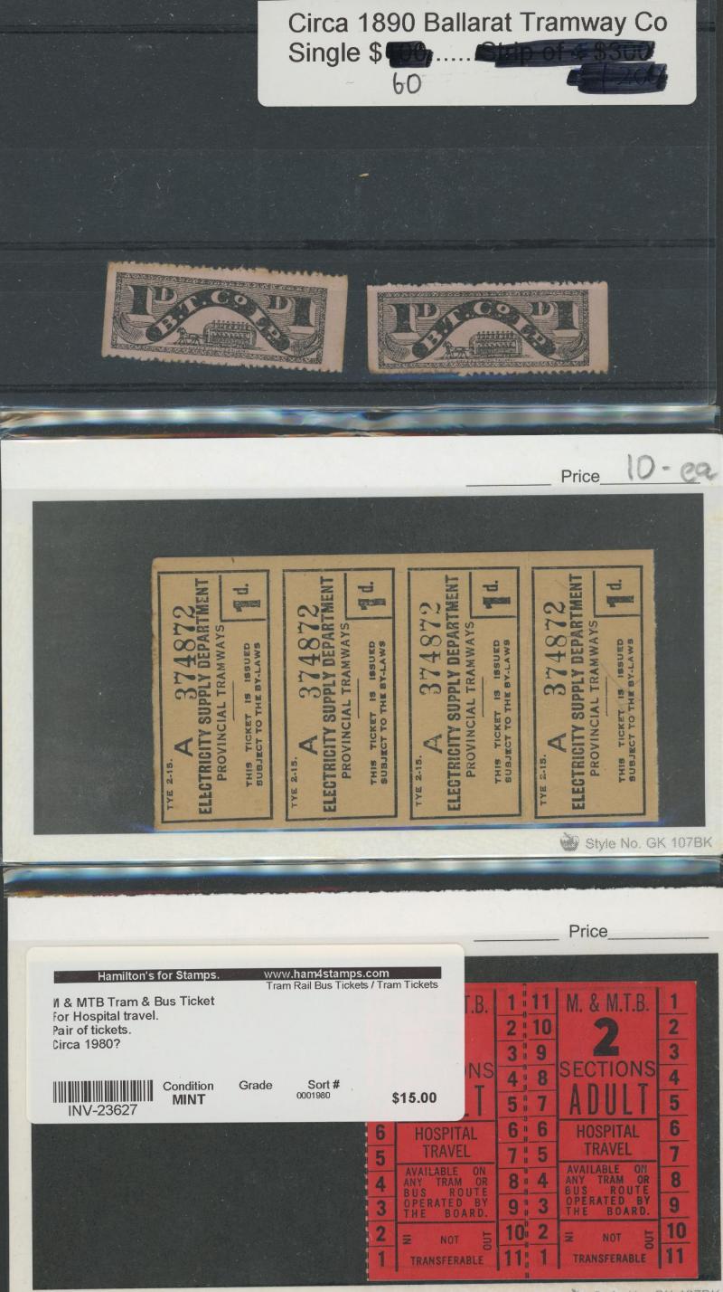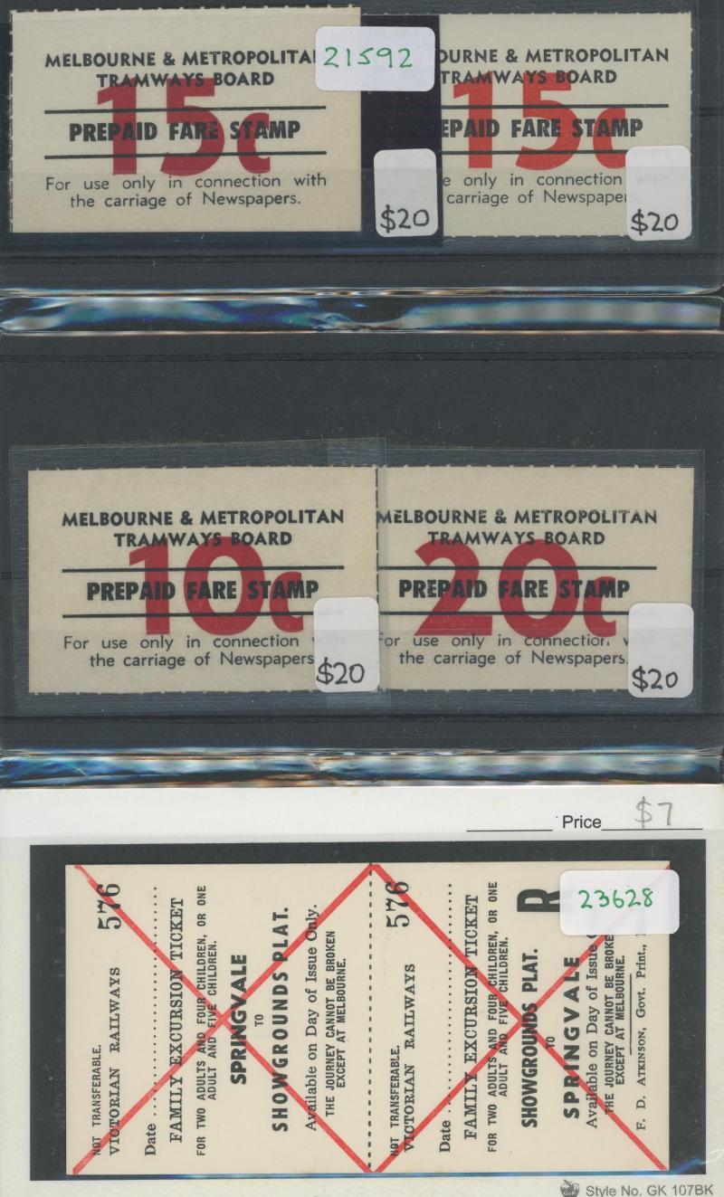 later issues including used Perf 12x12x12xRouletted 7d, '10d' in Red on 10d green and 3/- grey with the Watermark Sideways, etc, plus a variety of tram tickets, etc, including 1960-65 Pensioner's Fare Concession Certificates complete (all but one in