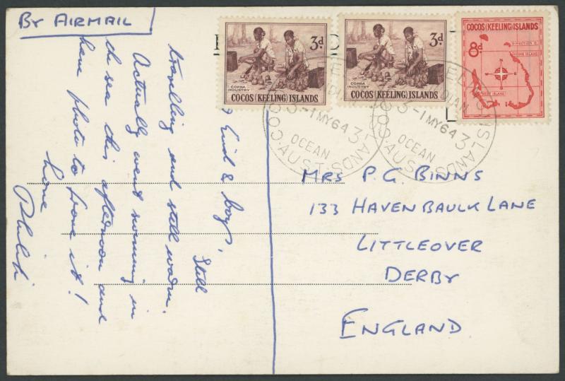 1964 (May 1) social usage of local PPC ('Highest Landmark, Cocos Island') to GB with Pictorials 3d Copra x2 + 8d Map tied by #3