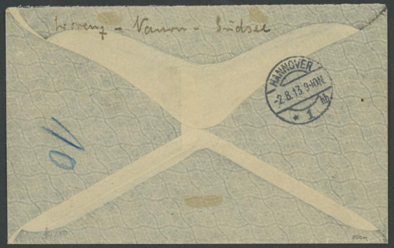 10pf red, 20pf blue and 25pf orange & black tied by five very fine strikes of 'NAURU/MARSHALL-/INSELN' bridge cds and 'Nauru/(Marshall-Inseln)' black & red/white R label alongside, Hannover '-2.8.13' arrival backstamp. Overpaid but very attractive. (Image1) (Image2)