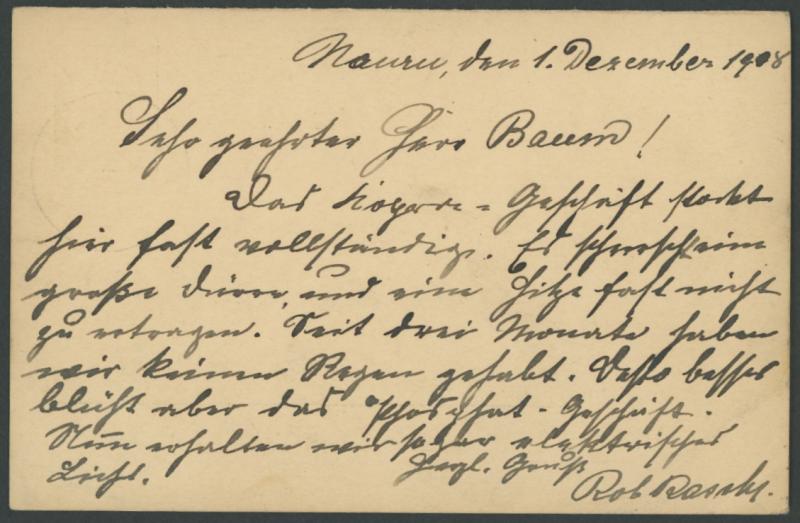 with lengthy social message in ink on the reverse, light but otherwise very fine strike of 'NAURU/MARSHALL-/INSELN' bridge cds, a few minor transmission marks. (Image1) (Image2)