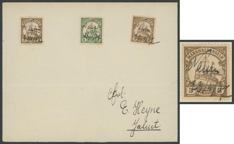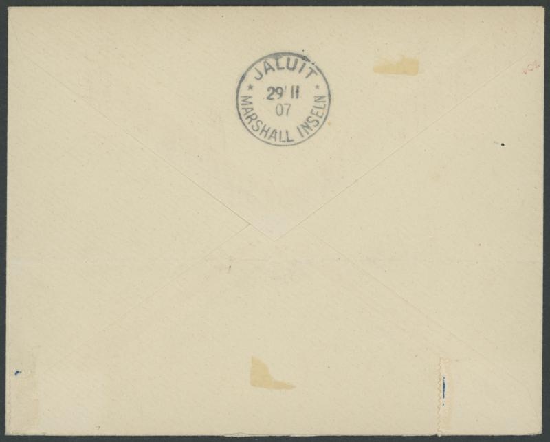 with "Nauru/23/11/07" manuscript cancels in black ink (one tying stamp to envelope), very fine 'JALUIT/29 11/07/MARSHALL INSELN' arrival backstamp, light horizontal fold well clear of the stamps & a couple of adhesion spots on the reverse. (Image1) (Image2)