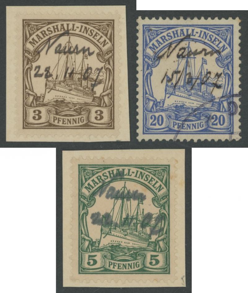 POSTMARKS: Atoll Post "Nauru" manuscript cancels in black ink on Marshall Islands Yachts 3pf brown, 5pf green & 20pf blue, the