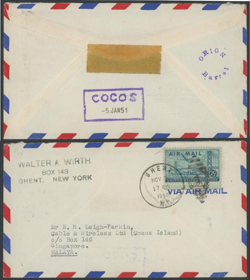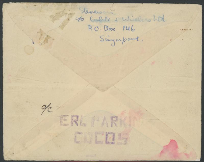 Wireless Ltd (Cocos Islands), c/o PO Box 146, Singapore, Malaya", superb circular 'ORION/Barrel' and boxed 'COCOS' Tin Can Mail cachets in violet on the reverse, the latter with '5JAN51' handstamp added, small cellotape seal on the reverse clear of